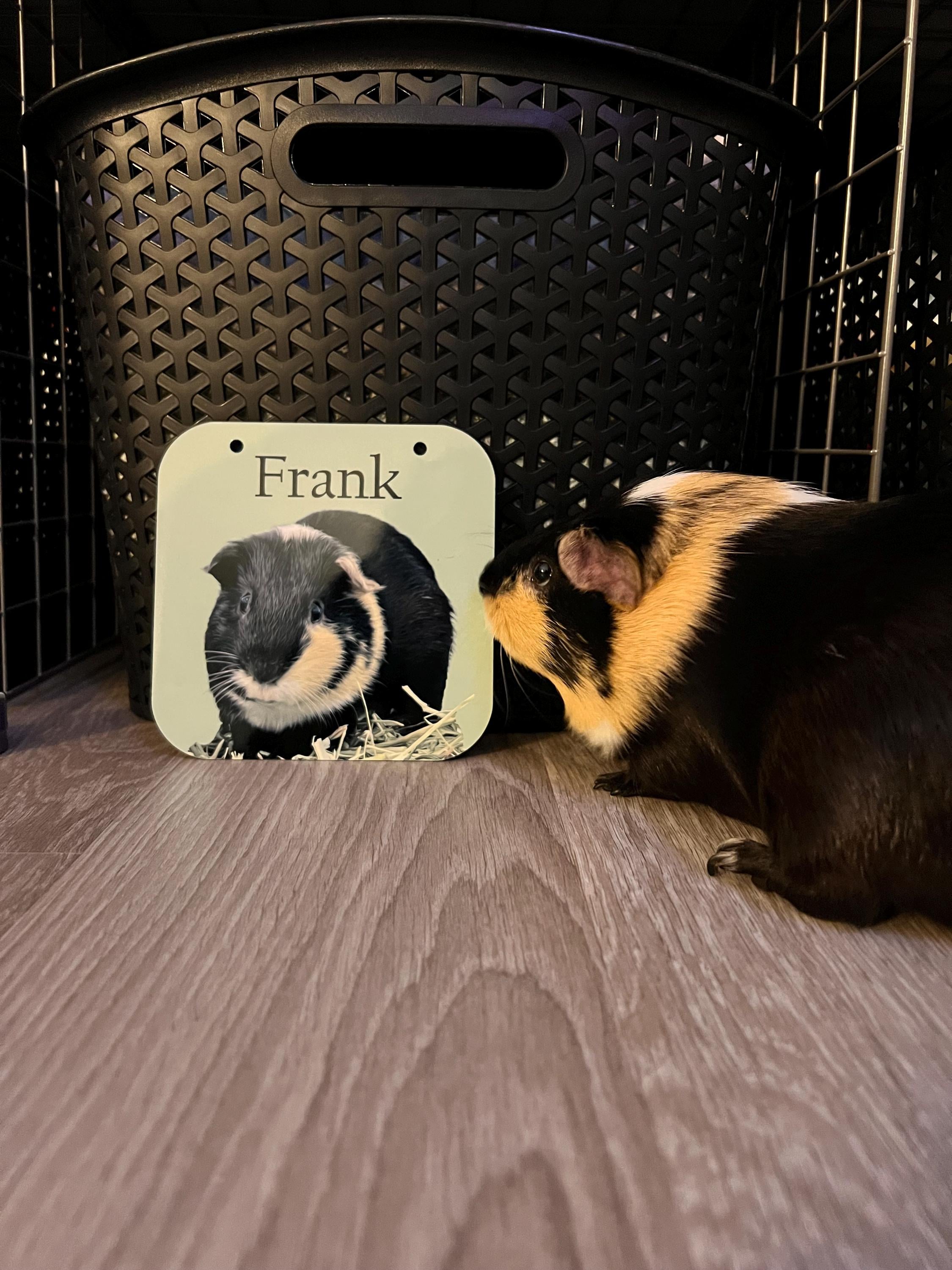 This Guinea Pig Cage Name Tag is an adorable finishing touch to your Piggie's habitat. Produced using aluminum, this square personalized cage tag features your piggy baby's name and then below is a picture of your Guinea Pig with an oil painting effect.