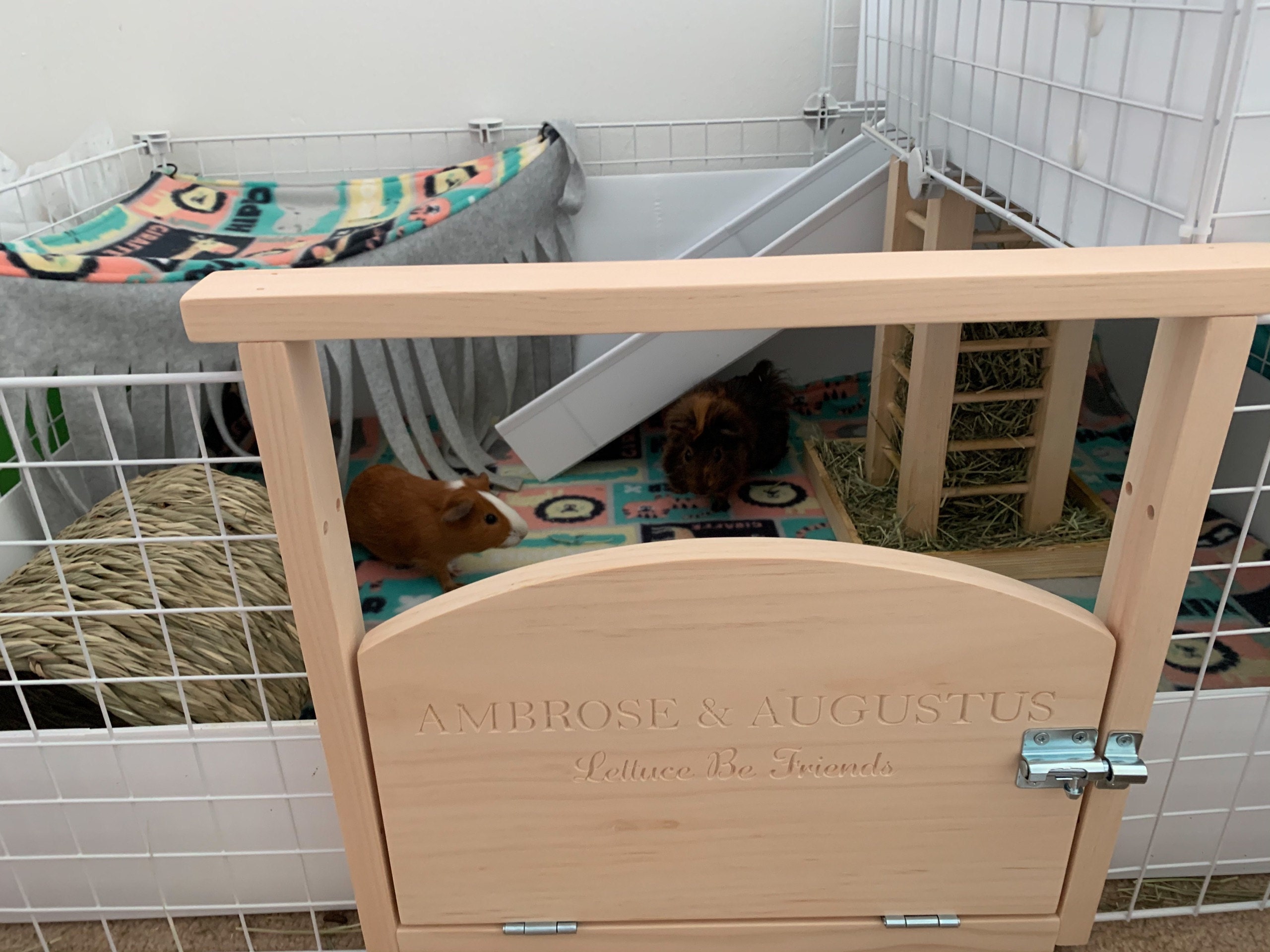 Do you want to up the cuteness level of your C&C Guinea Pig Cage?  Then you will love our wooden C&C Cage Door!  Designed to fit between the existing grids of your C&C Cage.  It easily slides into place.  Opens into a ramp style door. Your Guinea Pigs will love walking out of their own door for floor time or free roaming time.  Carved wording on Guinea Pig Gate reads your Guinea Pigs Names and "Lettuce Be Friends".