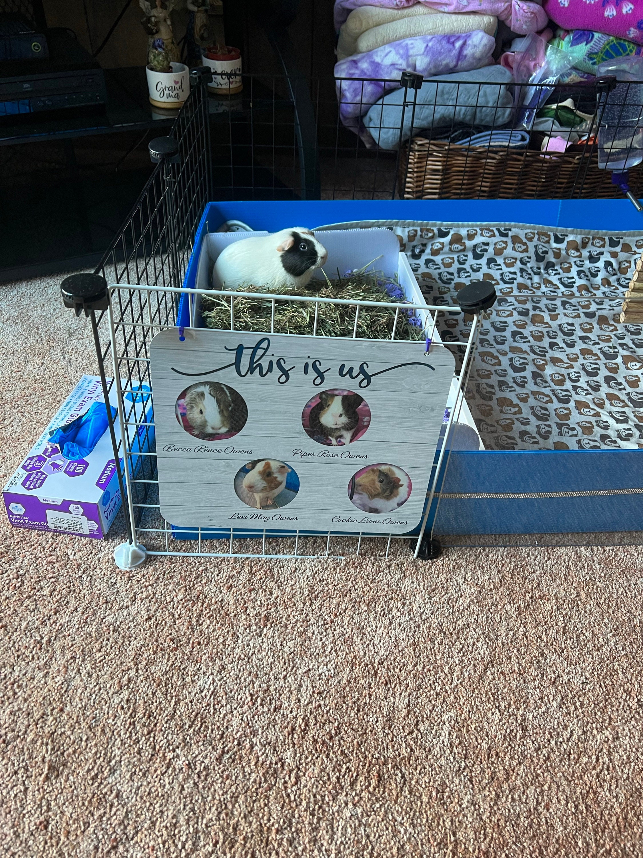 This Multiple Guinea Pig Cage Name Tag is an adorable finishing touch to your Piggies habitat.  Displaying a sweet header of words (in a navy blue shade) and produced using aluminum, this personalized cage tag features pictures of your Guinea Pigs with their names below on a gray distressed wood look.