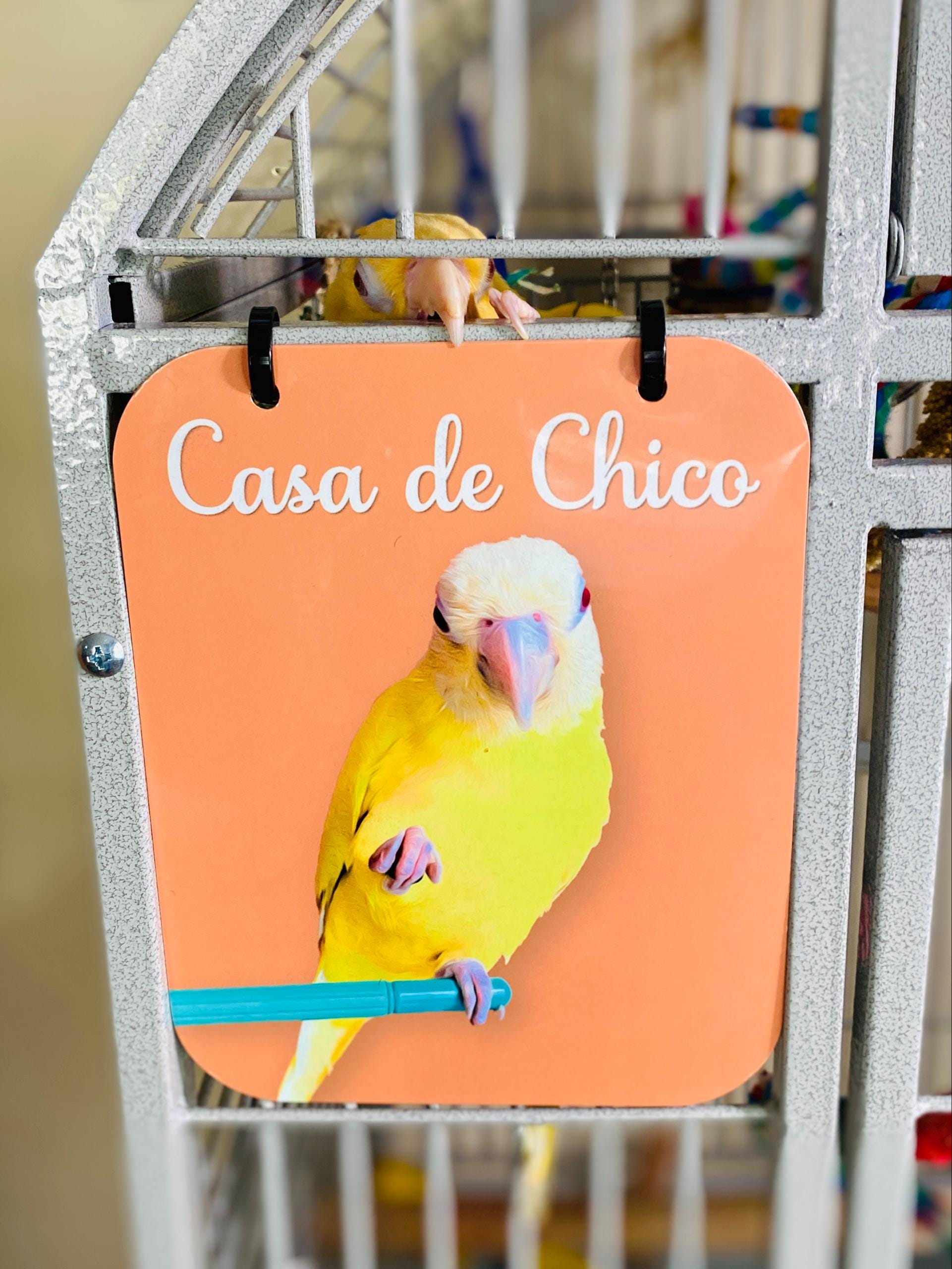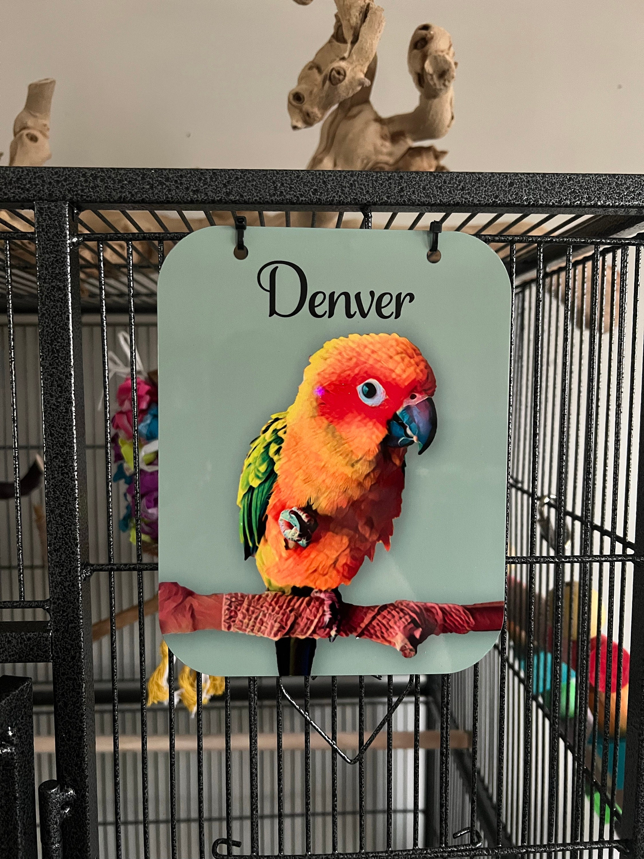This Bird Cage Name Tag is an adorable finishing touch to your Bird's Habitat.  Produced using aluminum, this personalized cage tag features your baby's name and then below is a picture of your bird with an oil painting effect.