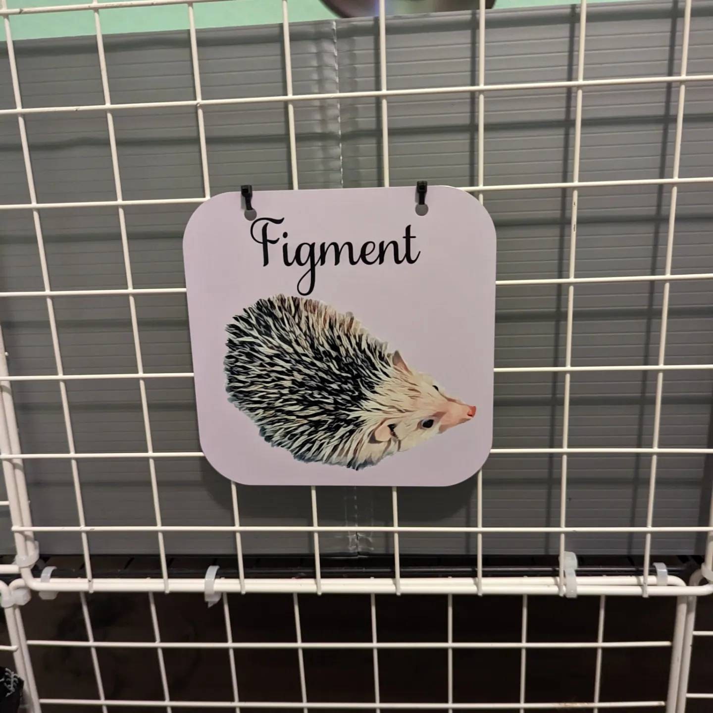 This Hedgehog Cage Name Tag is an adorable finishing touch to your Hedgie's habitat.  Produced using aluminum, this square personalized cage tag features your baby's name and then below is a picture of your Hedgehog with an oil painting effect.