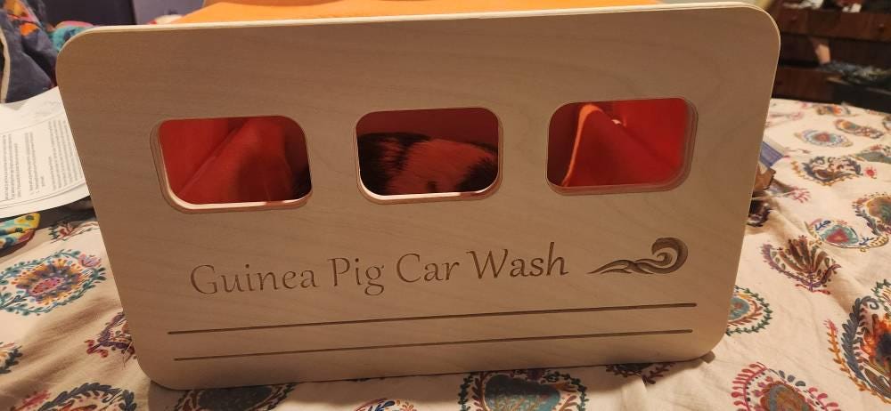 Our Car Wash inspired Wood Guinea Pig Hidey is a fun addition to your guinea pig decor! Produced using chew safe hardwood plywood, this guinea pig tunnel is sure to become one of your piggies favorites. Cut outs of the windows allow you to see your piggies in the comfort of their own security. Featuring a fleece lined top, the entry and exit have fringed detailing to allow easy access for your guinea pigs. Fleece can be removed for easy washing and changing out to other available colors.