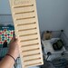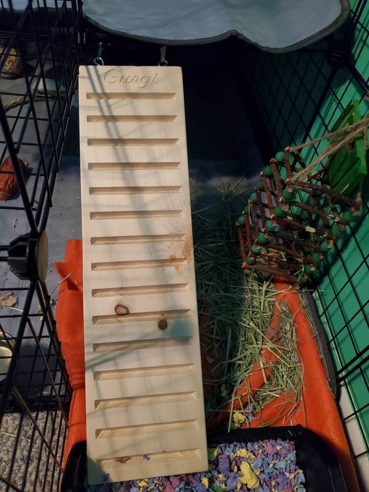 Our Guinea Pig Cage Wood Ramp will make a great addition your your Piggie's habitat.  Produced using kiln dried pine, the areas between the "steps" have been routed out so no glue or nails is used to produce the item.  Item is one solid piece.  A space is left at the top of the stairs to carve your Guinea baby's name.  Wood is left natural with no color applied.  Two teacup hooks are applied at the top for easy mounting.