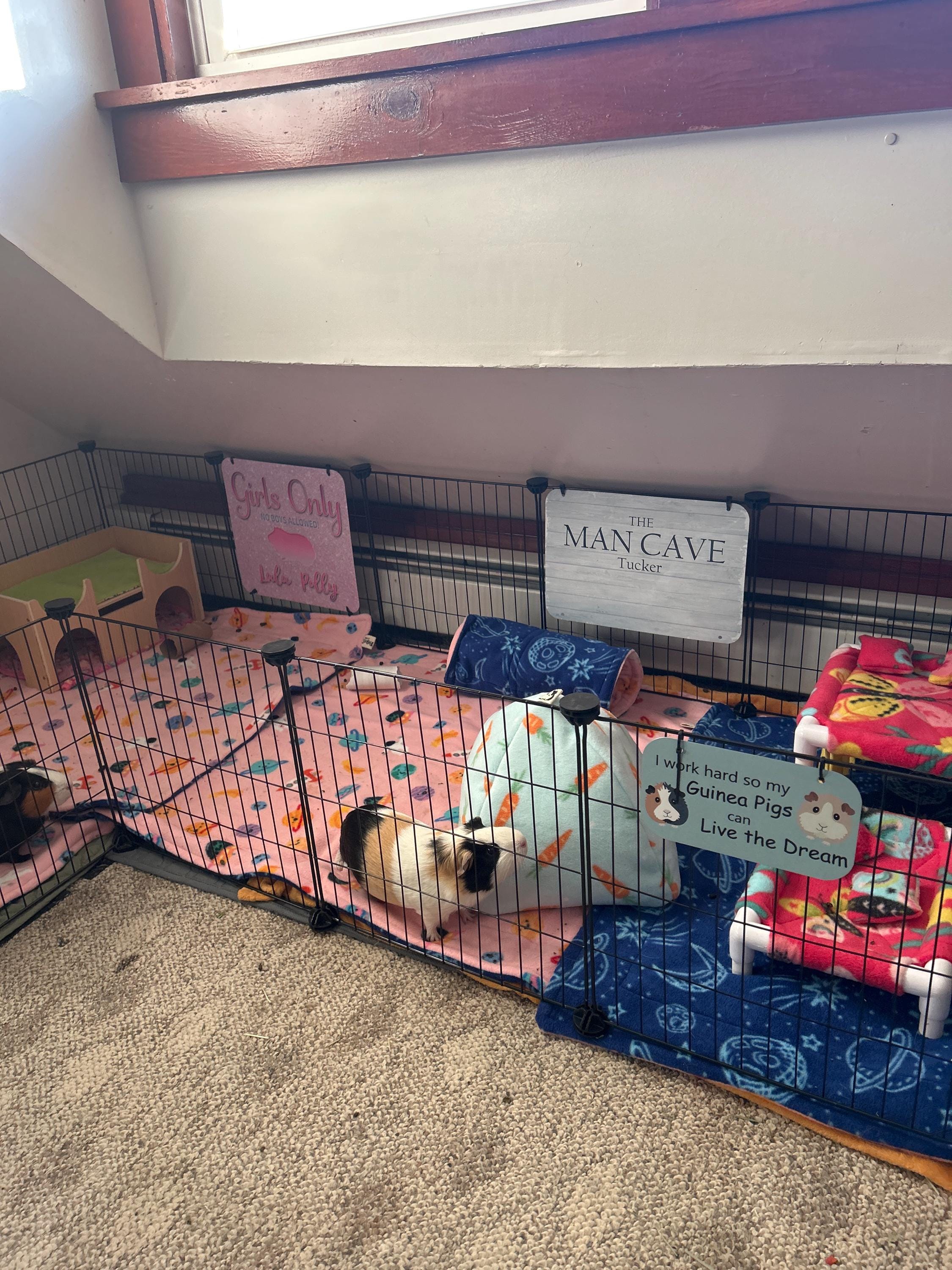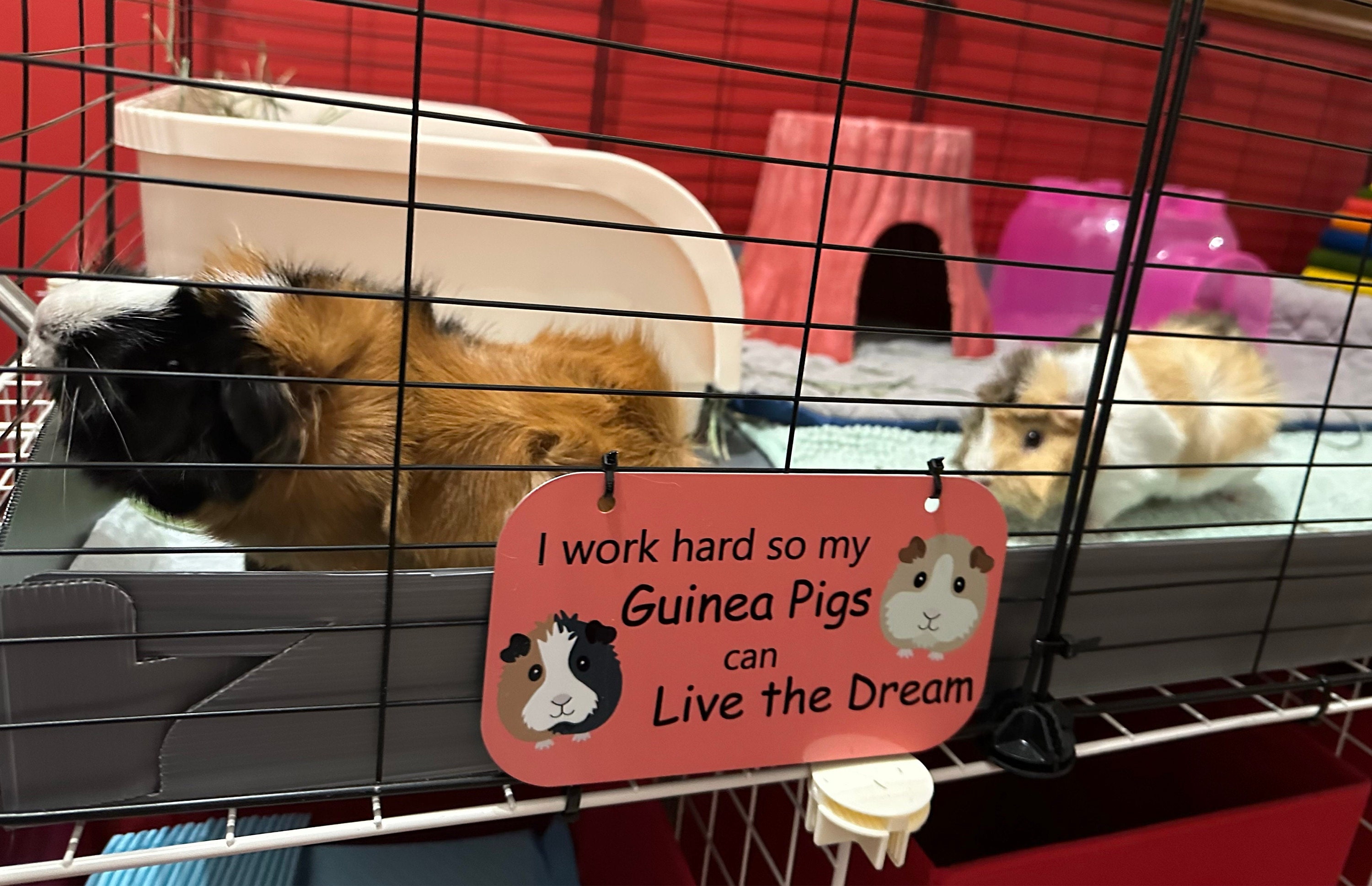 This Guinea Pig Cage Art is an adorable finishing touch to your Piggie's habitat.  Produced using .032" thick aluminum, this rectangular metal cage/wall art features the words "I work hard so my Guinea Pigs can Live the Dream" and two cartoon pictures of sweet Guinea Pig faces.