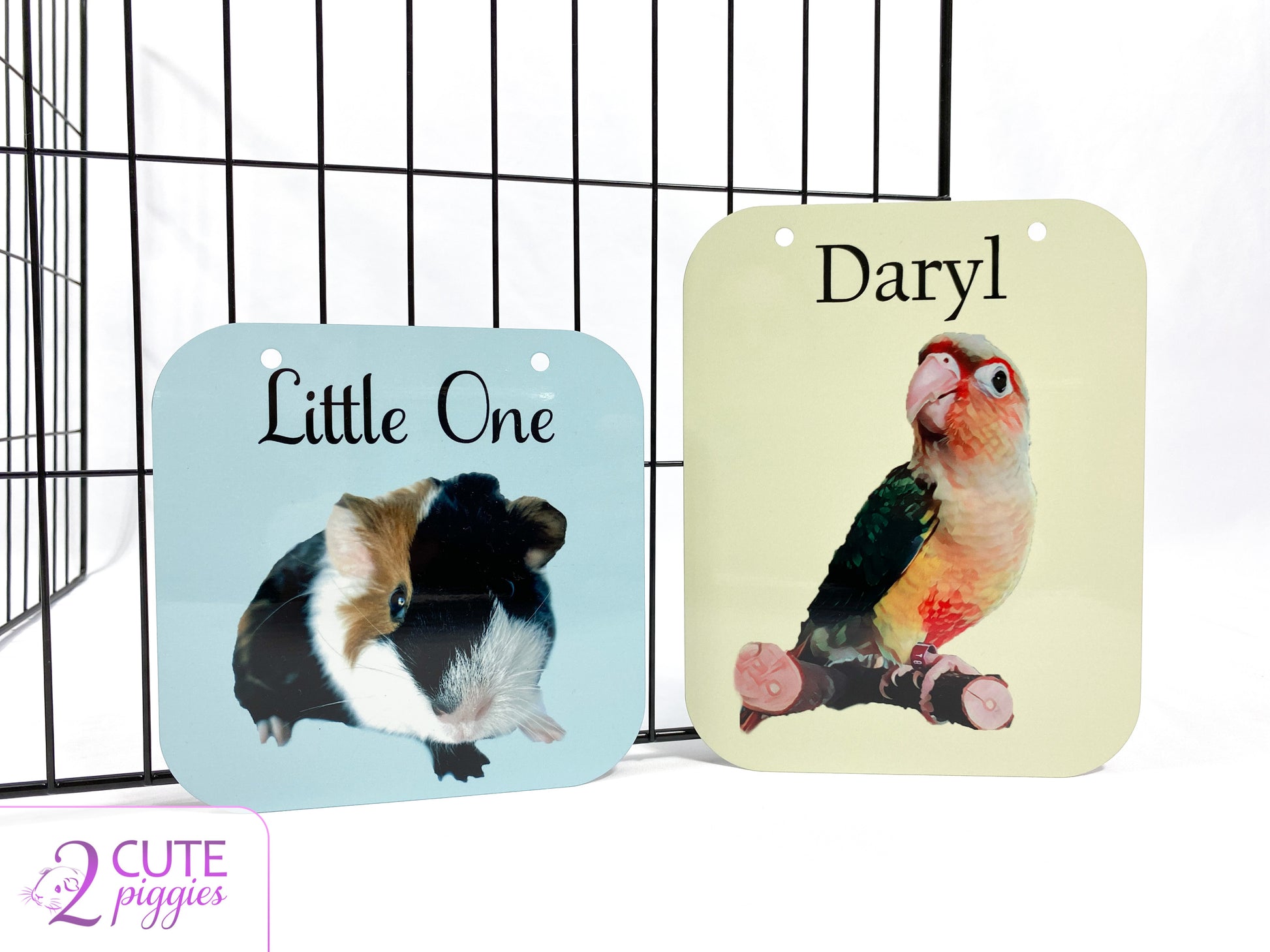 This Bird Cage Name Tag is an adorable finishing touch to your Bird's Habitat. Produced using aluminum, this personalized cage tag features your baby's name and then below is a picture of your bird with an oil painting effect.