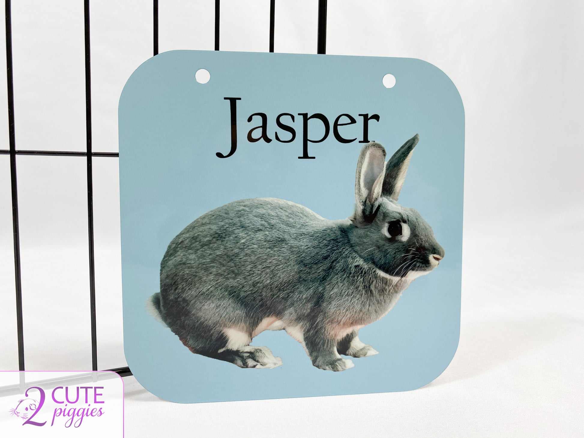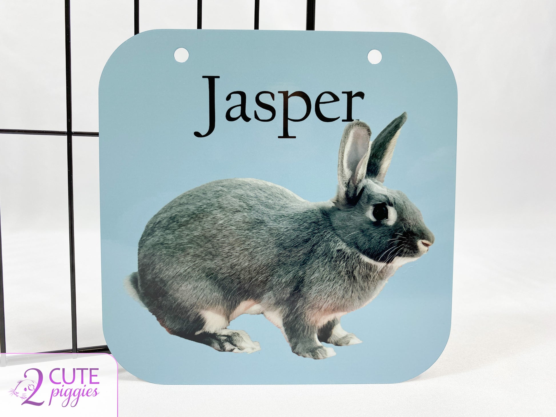 This Bunny Rabbit Cage Name Tag is an adorable finishing touch to your Rabbit's habitat. Produced using aluminum, this square personalized cage tag with curved corners features your bunny's name and then below is a picture of your Rabbit with an oil painting effect.