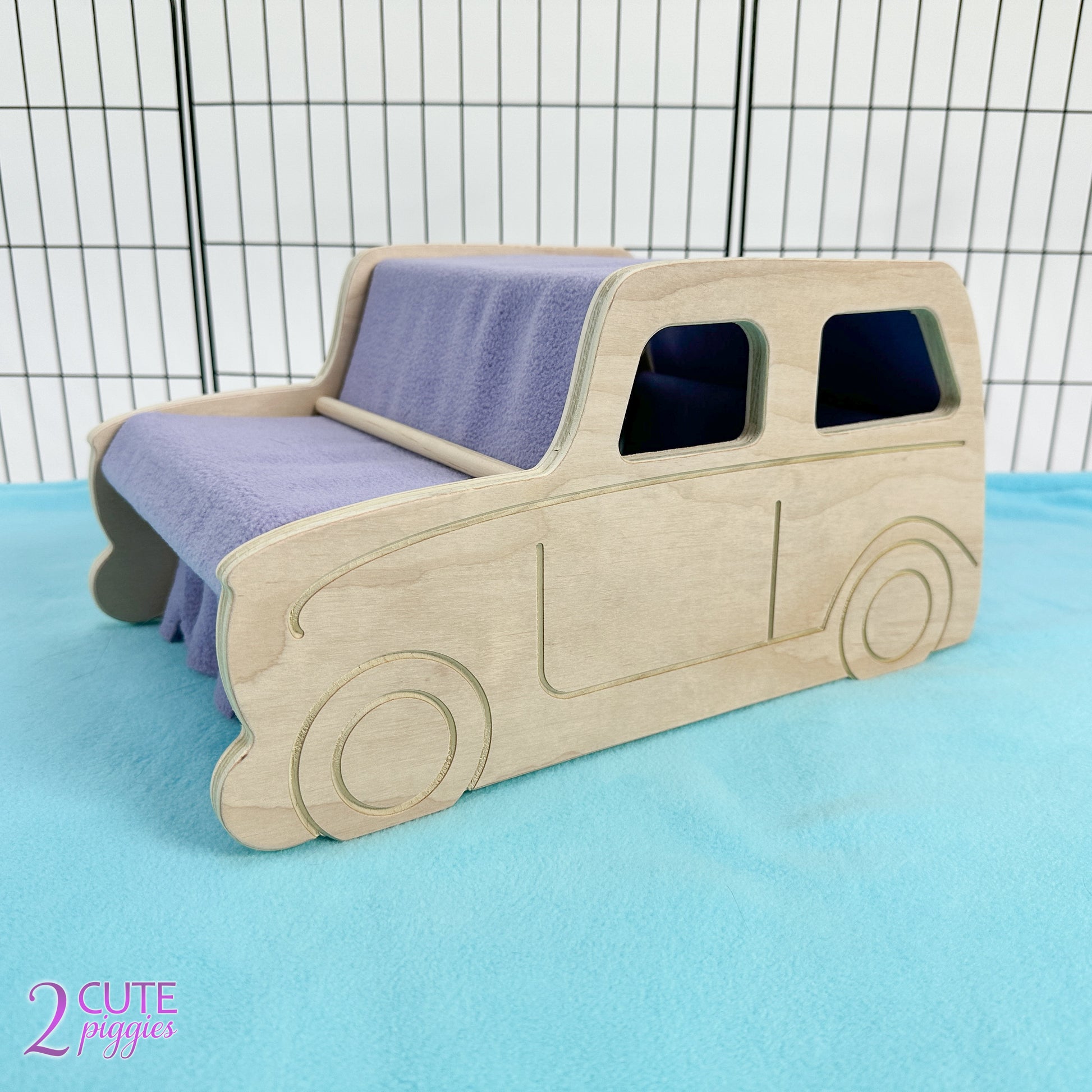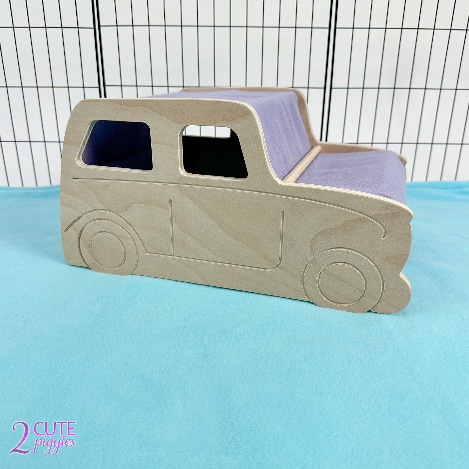 Our Car inspired Wood Guinea Pig Hidey is the perfect addition to your guinea pigs decor! Produced using chew safe hardwood plywood, this guinea pig tunnel is sure to become one of your piggies favorites making them feel safe and secure. Featuring a fleece lined top, the entry and exit have fringed detailing to allow easy access for your guinea pigs. Fleece can be removed for easy washing and changing out to additional available colors. Pair with our Camper Guinea Pig Hidey for the perfect ensemble!