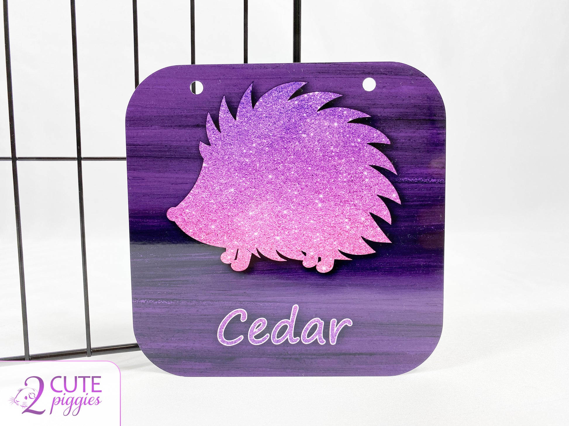 Our Hedgehog Cage Name Tag is an adorable finishing touch to your Hedgie's habitat. Produced using aluminum, this square personalized cage tag features a Hedgehog Silhouette in Ombre Glitter with your Hedgie's name under it on a Brushstroke background.