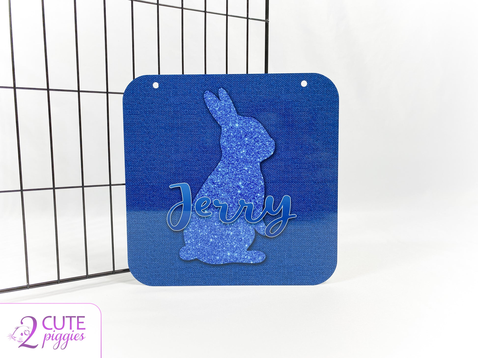 Our Upright Ears Rabbit Cage Name Tag is an adorable finishing touch to your Rabbit's habitat. Produced using aluminum, this square personalized cage tag features a Glitter look Rabbit Silhouette on a coordinating linen look background with your Bunnies name over the top of the silhouette.